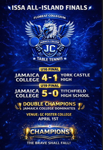 Jamaica College U19 defeated Kingston College 5-0 and Johnathan Grant U16 4-1 in the semi-finals of the ISSA TABLE TENNIS LEAGUE.